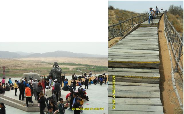 沿著黃河?xùn)|岸,由南向北,走在河岸邊的木質(zhì)人行棧道上,微風(fēng)輕拂,游客熙熙攘攘。棧道下面,不時(shí)發(fā)出一陣陣黃河浪拍打岸邊卵石的聲音,棧道西側(cè)是廣際的黃河河面,沙坡頭特有的羊皮筏子載著游客,順著主河道東側(cè)漂流而過(guò),偶爾漂入浪谷,游客不時(shí)發(fā)出一些驚嚇聲;主河道及西側(cè),間或有旅游快艇飛馳而過(guò),拉起一道道浪花。棧道東側(cè)是旅游觀光車(chē)的通道,乘坐觀光車(chē)每人次費(fèi)用20元,觀光車(chē)駕駛員兼講解員,沿途不停的向游客解說(shuō)景點(diǎn)。路邊涼皮、涼面小攤,食物價(jià)格不菲,一份6元的涼皮、涼面賣(mài)到10元,一只4元的鹵雞腿售價(jià)7元,普通瓶裝健力寶等飲料賣(mài)到5元,比市區(qū)價(jià)格多出2元。